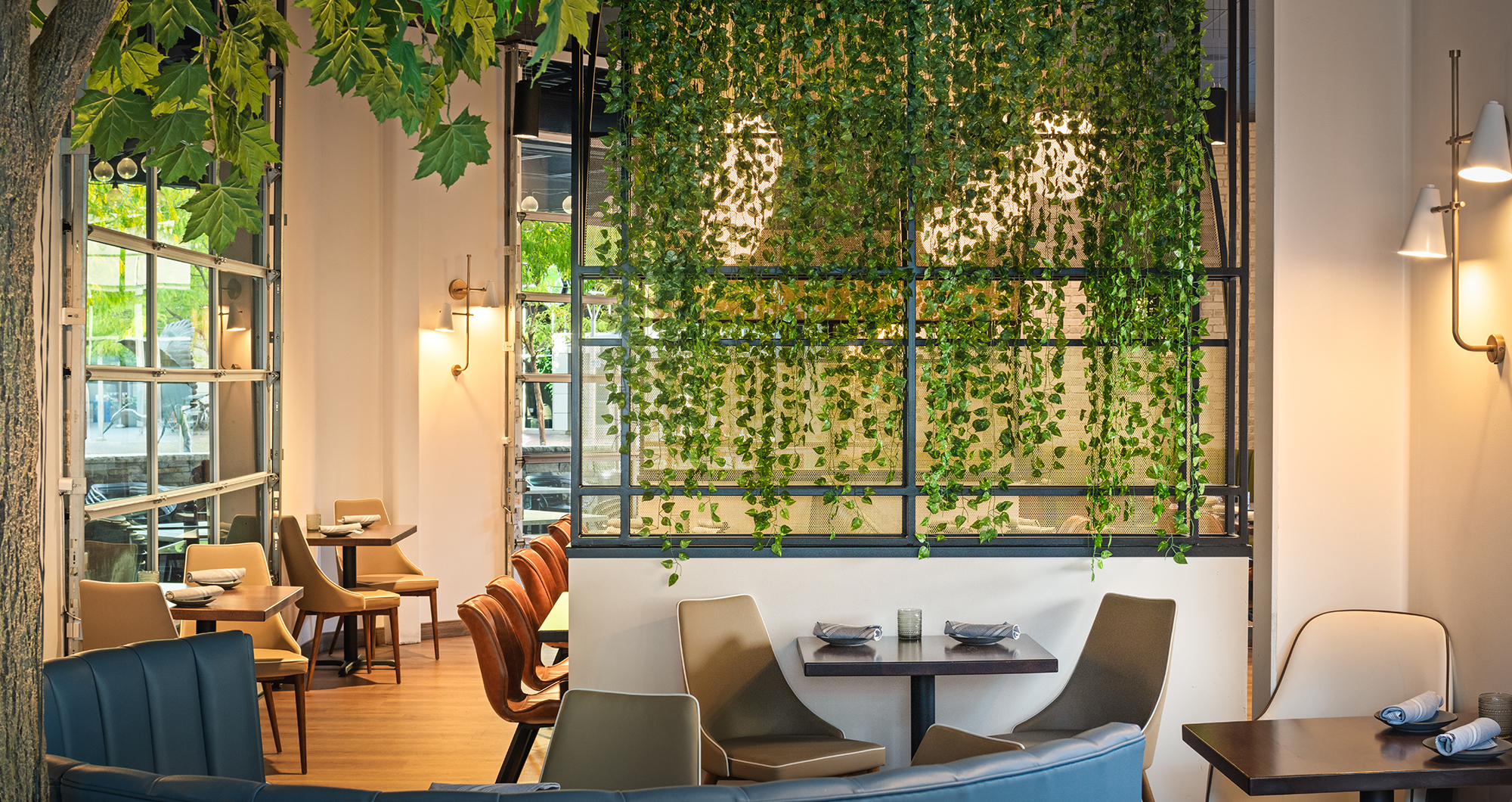 The design incorporates black anodized metal, rich wood textures, gold mesh, and orb lighting, creating a modern yet timeless atmosphere. Guests are welcomed by an illuminated logo on a moss wall, echoing Italy’s countryside. A striking artificial maple tree, symbolizing the restaurant’s Italian roots—”Acero” means “maple”—is central to the design. The project involved remodeling the dining area, the exterior patio, and the restaurant’s layout. The indoor/outdoor bar was relocated to foster a more inviting vibe with a clear view of the feature tree. The previous flexible seating space was reconfigured for functionality and intimacy, featuring a custom booth crafted from an anodized arch with gold panels. A beautifully lit wine section entices passersby, inviting them to discover what awaits inside.