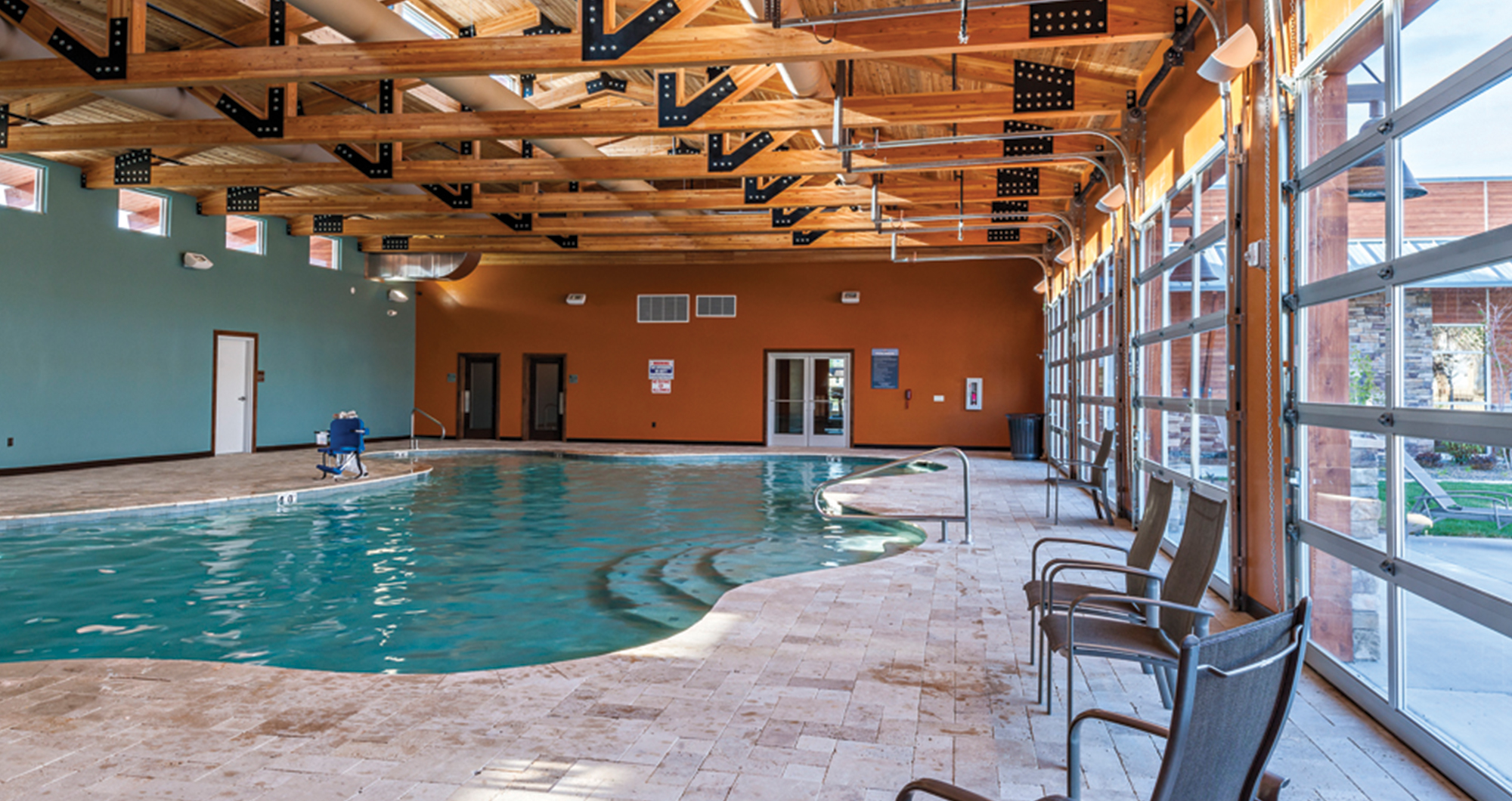 Large, glass roll-up doors surround the indoor pool allowing indoor/outdoor spaces in warm seasons. Elegant interior finishes compliment the views from weight room, meeting and lobby spaces.