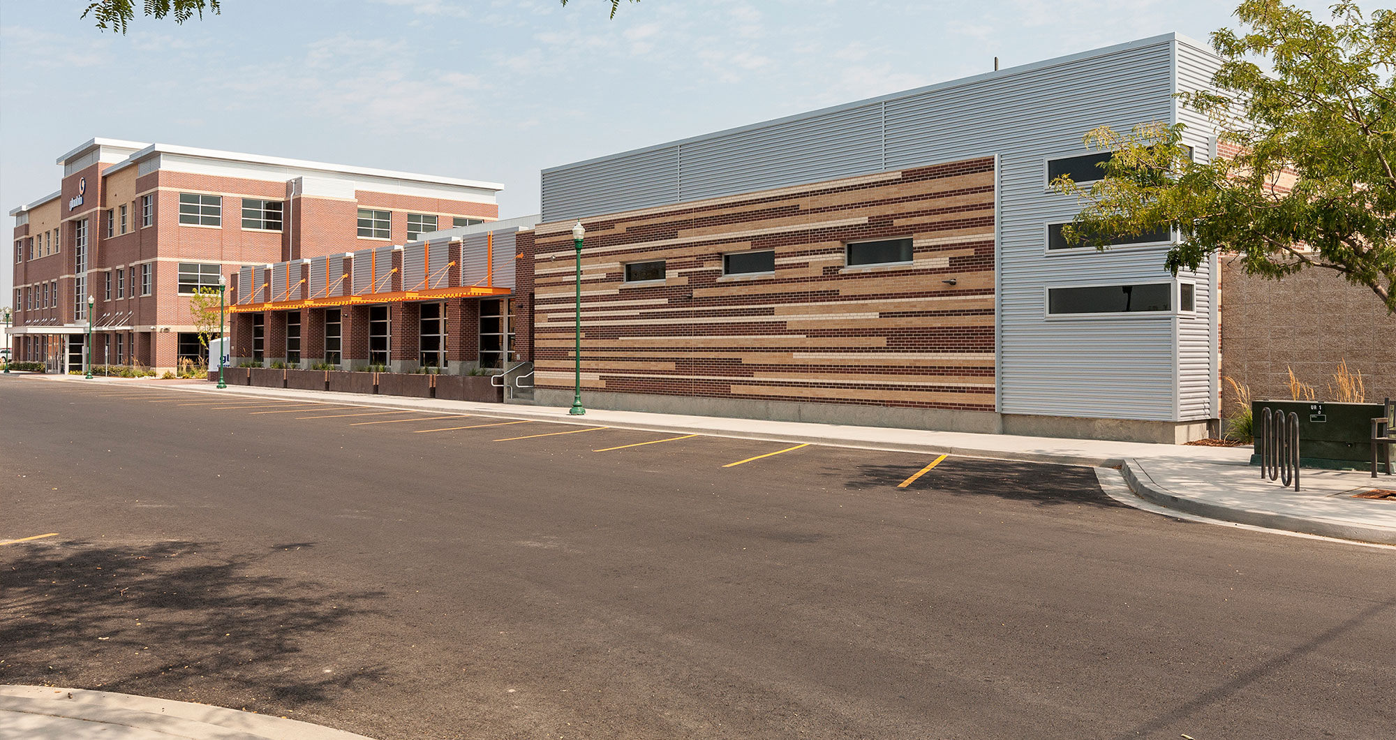 The one-story CLC is constructed of a steel structural frame with brick veneer pilasters, storefront windows and metal panel accents. The massing and materials selection for the building were influenced by the project’s location in the City of Twin Falls’ Historic Warehouse District and include steel canopies and striated brick colors to provide texture and movement to each facade.