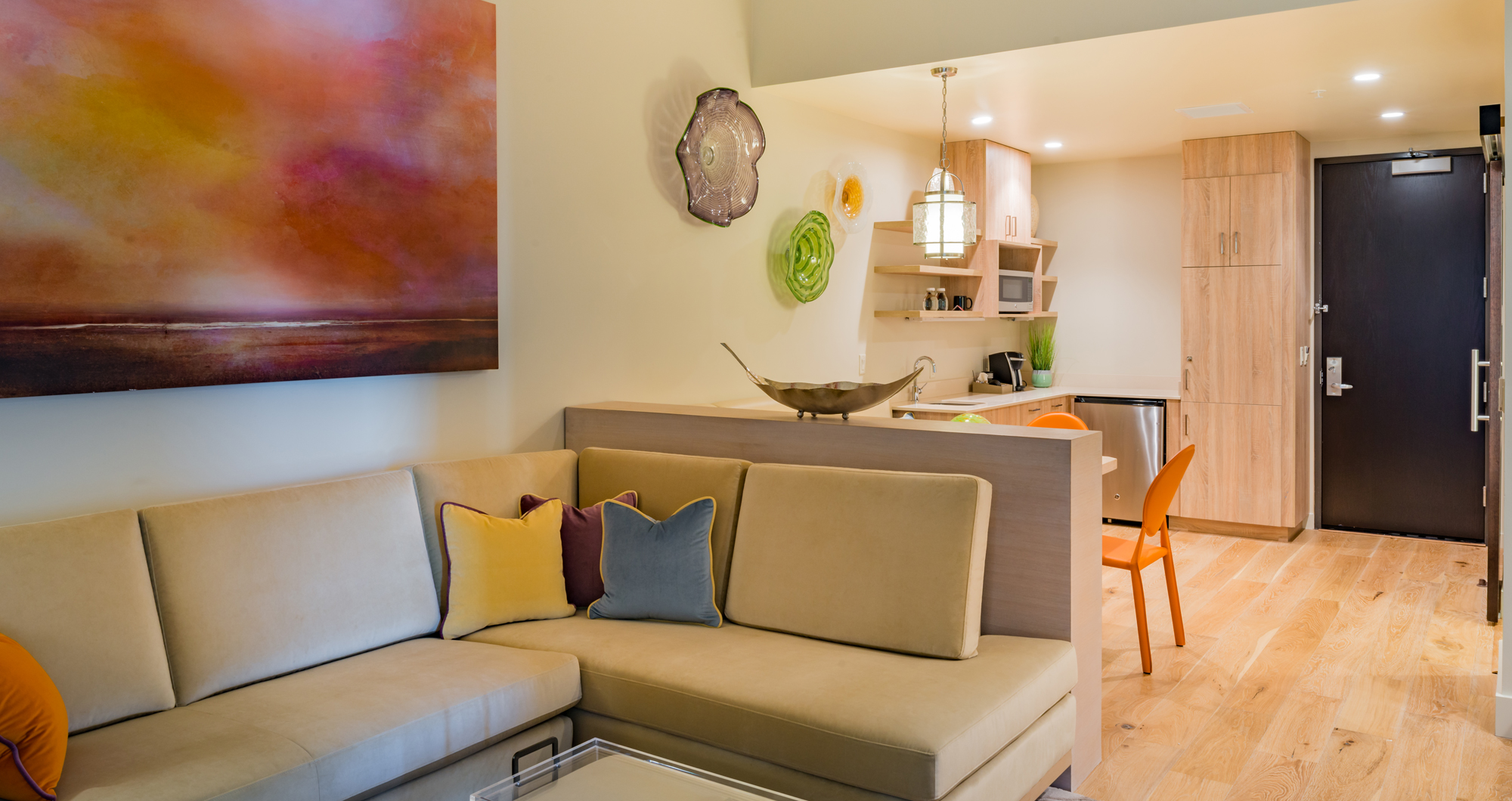 As a downtown infill project, the hotel’s orientation and site placement were critical. The 101,400-SF building sets back slightly from the corner creating an entry drive. The drive, which is decorative concrete, is adjacent to the sidewalk and acts much like an urban plaza with decorative landscaping and oversized planter pots filled with colorful flowers and foliage. Lattices, plantings, and climbing vines soften the building, creating a visually interesting pedestrian experience while screening parking. The exterior landscaping also features low seat-walls and public art.