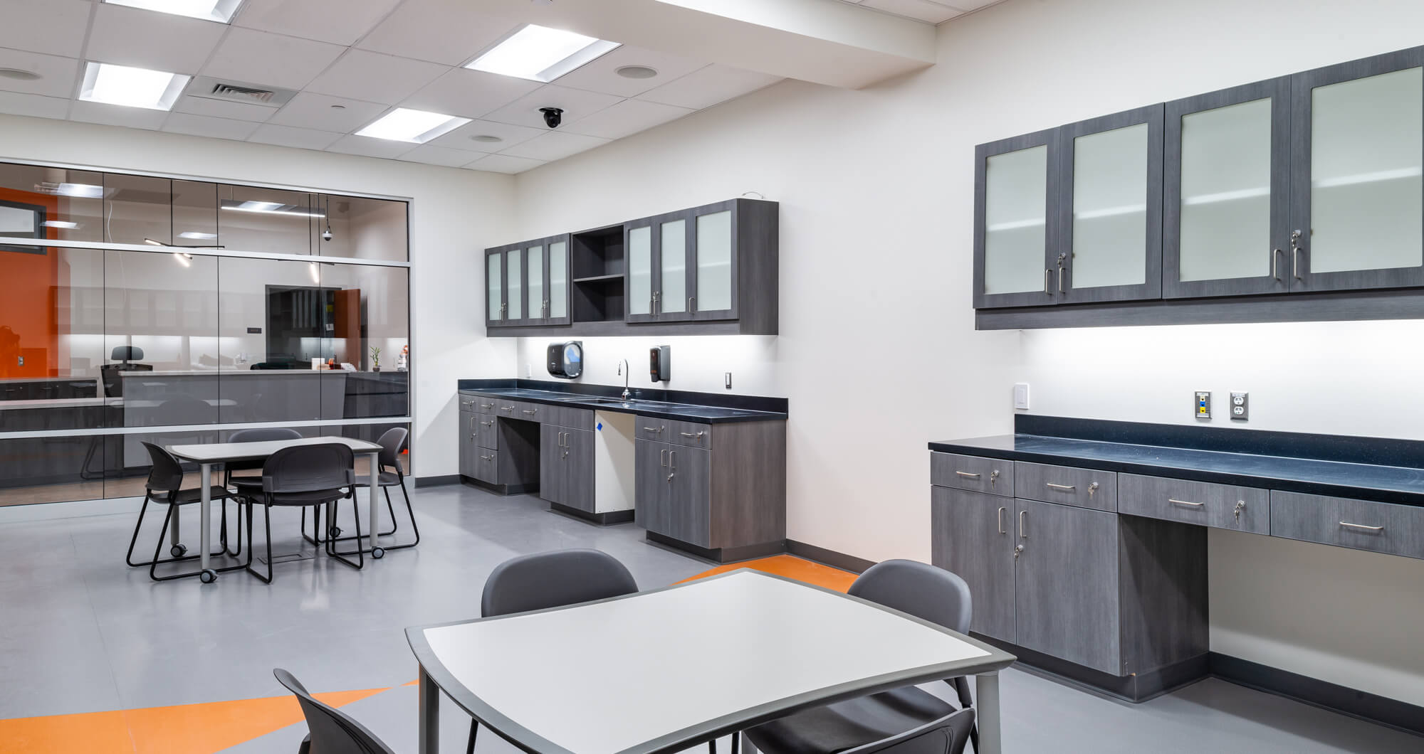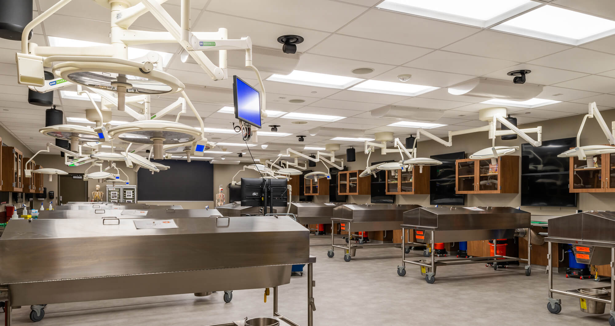 This project is an addition in the existing exterior courtyard space immediately adjacent to the existing Anatomy and Physiology Lab at the Meridian Health Science Center, Meridian, Idaho. The addition incorporates state-of-the art anatomy and physiology labs/cadaver room for 12-14 cadaver stations including the prep and storage, adjacent IT telecommunications room, storage room, and future ancillary lab support spaces. This new lab laboratory includes virtual technology applications with Distance Learning (DL) capabilities to interface with the existing A & P Lab. The new cadaver laboratory is connected by a new service corridor extension adjacent to the new cadaver lab from the existing exit/service corridor. This new corridor extension serves as the new extended service entrance at the east end.