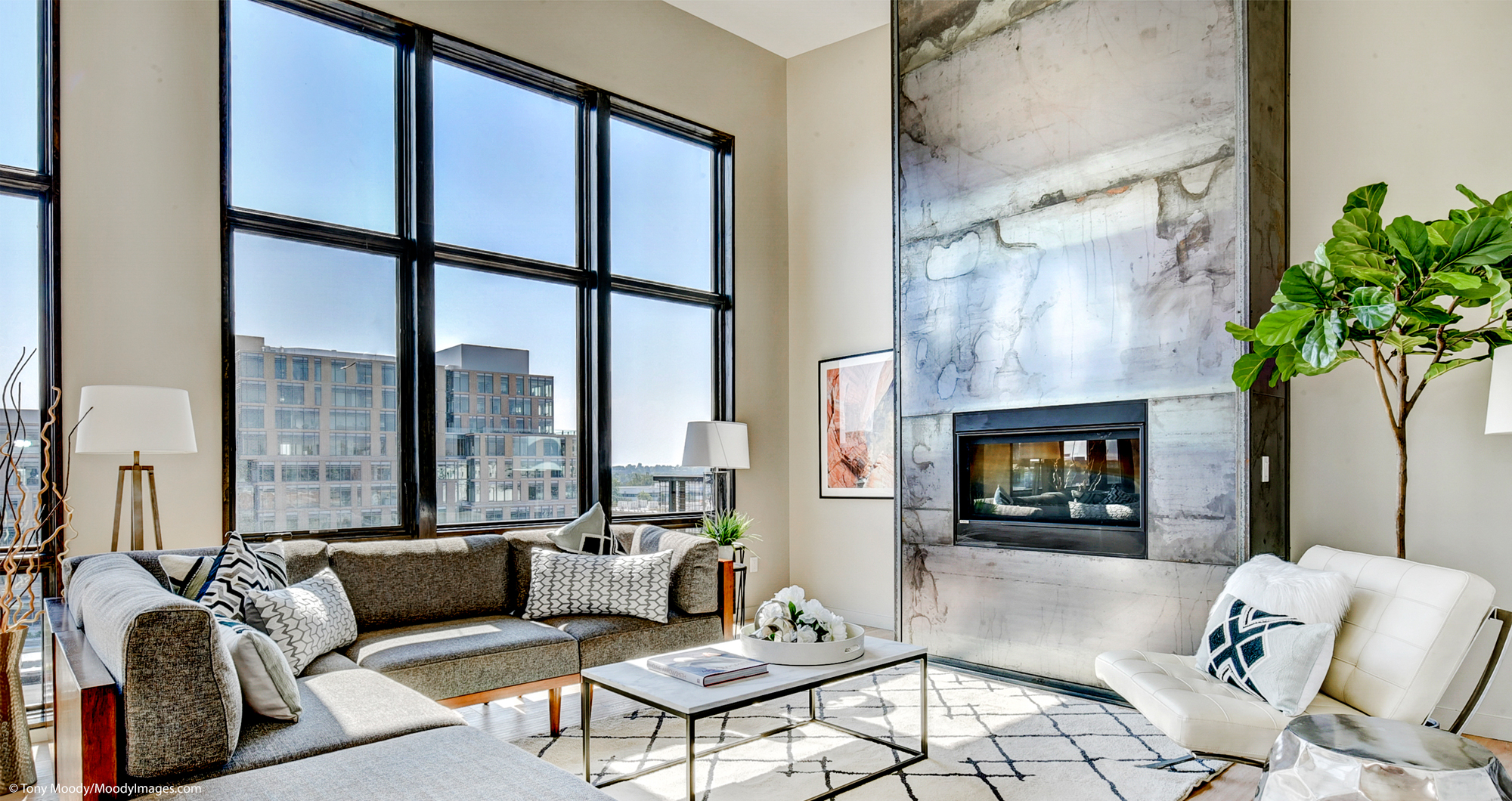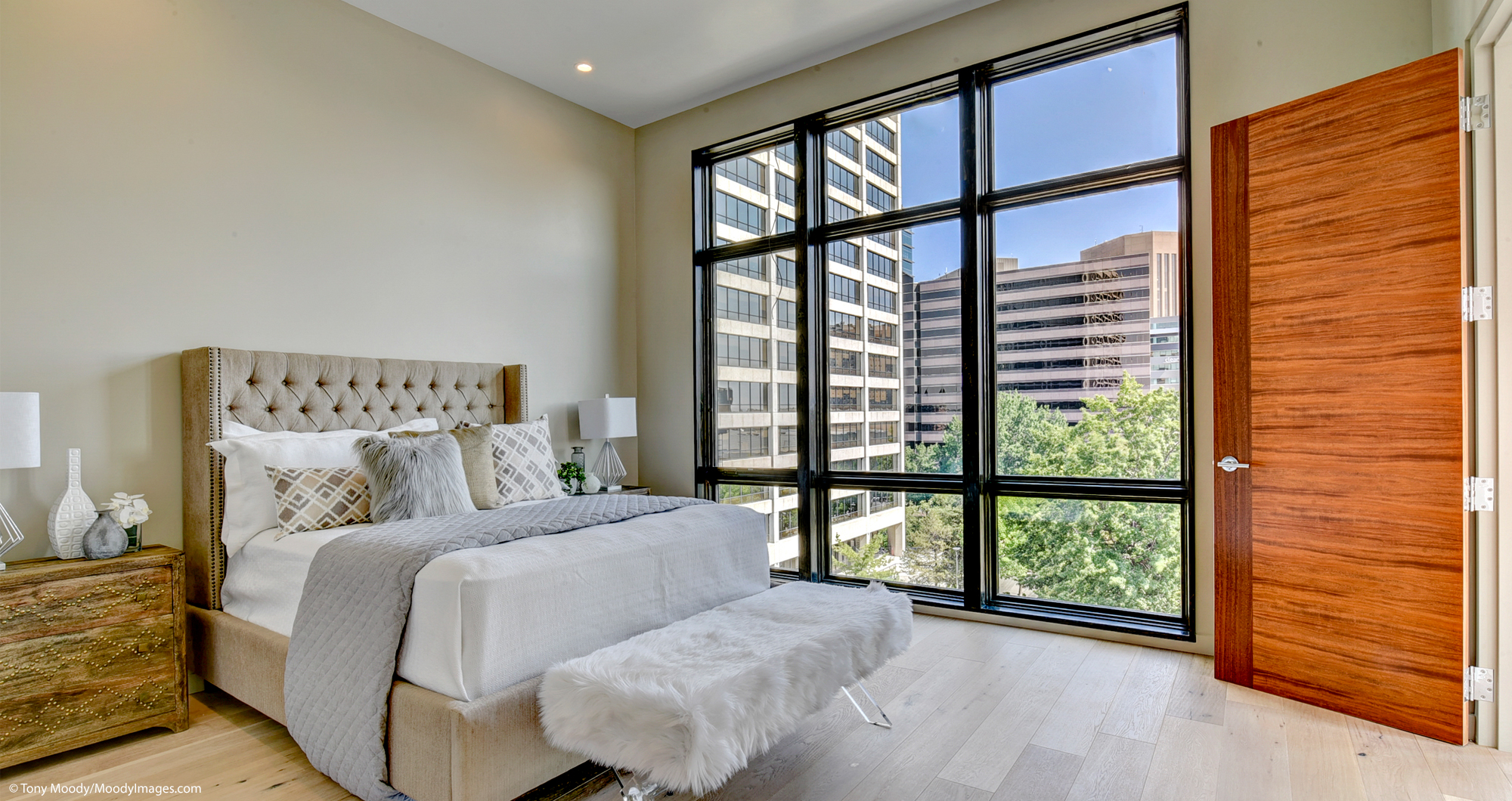 The condos comprise 27 units of two and three bedrooms, each with unique layouts. Floors three through five have 10+ foot ceilings. The top level has 12+ foot ceilings. All units have open floor plans, Euro-styled hardwood cabinets, contemporary features and private outdoor balconies. Common areas include an elegant lobby and dog washing station. Floor plans range from 1,176 sf to 2,340 sf and prices from $384,000 to $947,000. Every unit has a parking space and huge storage space.