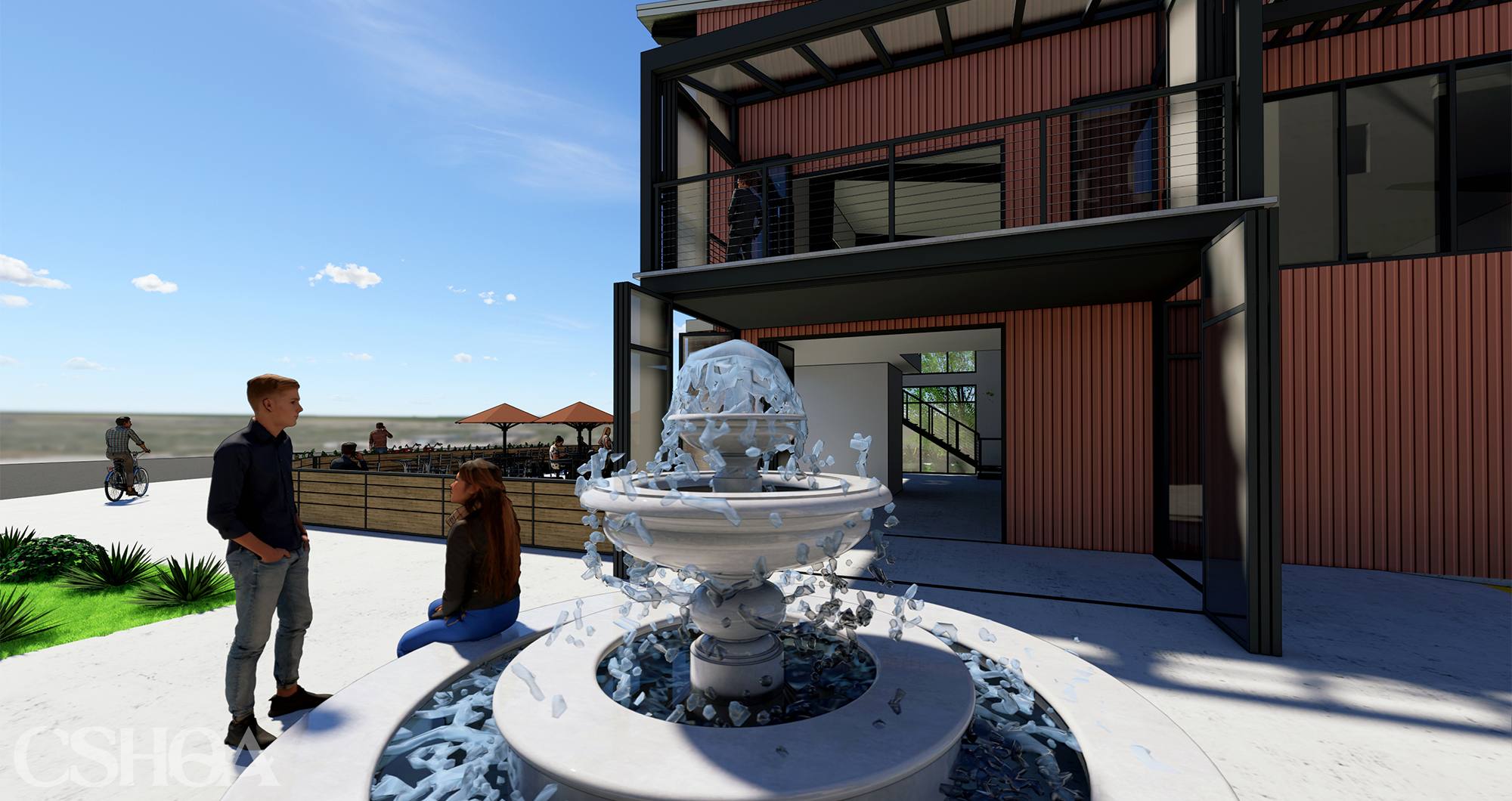 The project further integrates a two-level restaurant to be occupied by locally acclaimed restaurant “The Waffle Experience.” The restaurant and kitchen are on the first floor with interior elevator and staircase access to the full-service coffee and tea bars on the second floor. The dining area extends to the exterior with a large open patio at the front and smaller covered patios with folding glass walls. The operable glass walls will transform and create multiple experiences year-round. Corrugated metal panels and bricks are carried over to maintain a visual relationship between the two buildings. The simple metal shed-style roof emphasizes a clean, contemporary, and minimalistic appearance.