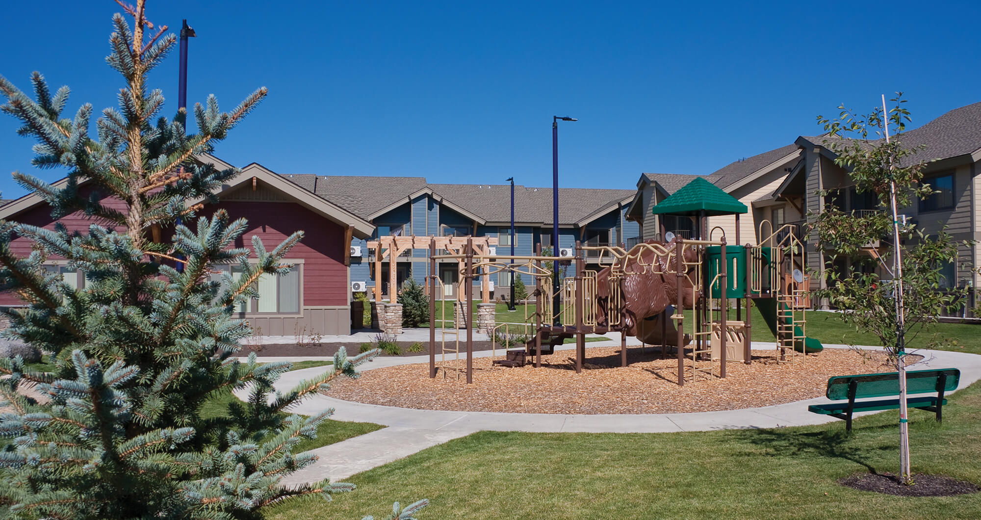 Outdoor common space with trellis, playground, benches, tables and barbecues