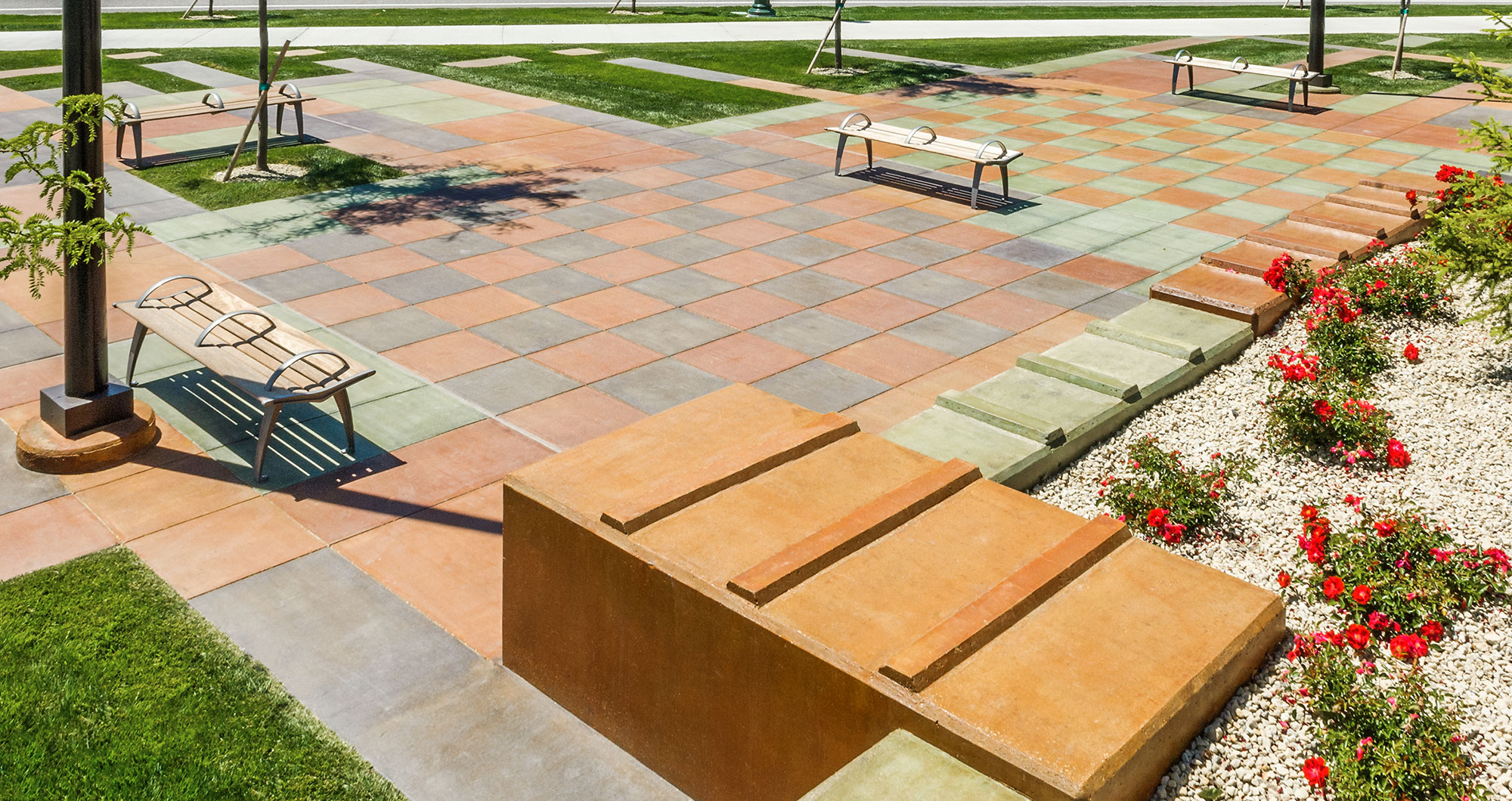 The winning solution includes a high screening wall and a charming pocket park that complements both the site and 100-year-old Julia Davis Park across the street. Patterned, multi-colored brick and stone engage the eye on all four sides. Large display windows face the busy Broadway traffic, and pedestrians and drivers alike are treated to a colorful park with large, hardscape planters, a colored concrete chessboard and attractive, low-water plantings. Ornamental streetlights finish the look along Myrtle Street.